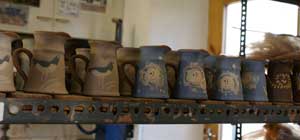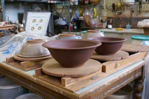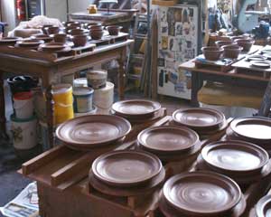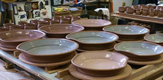 Located in the former school at Barnbarroch, the premises have made an ideal pottery. The domestic ware is largely thrown on the wheel and decorated using coloured slips which are poured, trailed, brushed and sponged. The pots are glazed and re-fired to 1095 degrees centigrade. They are both oven and dishwasher friendly. Other pieces, such as long serving dishes, are extruded with applied edges and handles. These are both useful and pleasing as pictures in their own right.